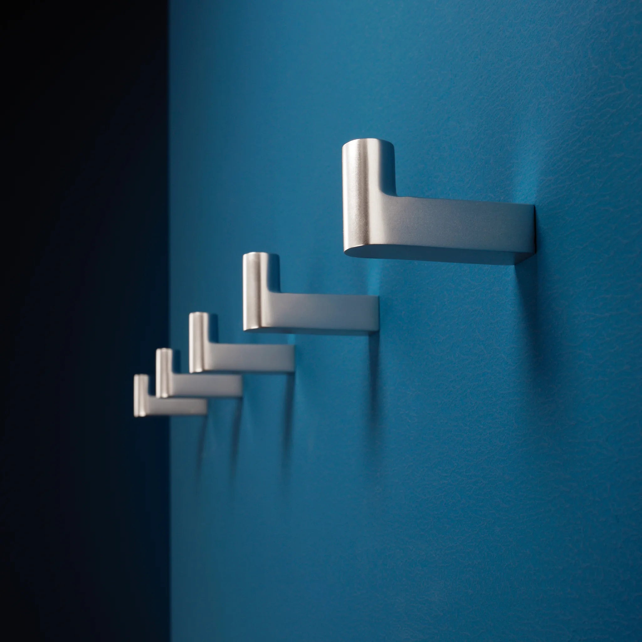 Zwei geometrische Grundformen bilden diesen schlichten wie originellen Wandhaken, der mit dem gleichnamigen Türdrücker von Peter Bastian verwandt ist. An einen länglichen Quader schließt sich die nach oben gerichtete Säule im rechten Winkel an. Ergänzt wird „1001“ durch eine passende Garderobenleiste, die ebenfalls aus Aluminium besteht.
