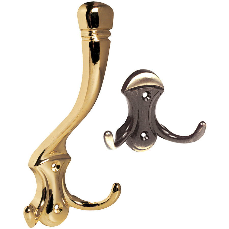 Der kleine Doppelhaken (Brüniert): Die brünierte Veredelung erzeugt eine dunkle, patinierte Altbronze-Optik. Dieser Haken transportiert eine authentische Vintage-Ästhetik und harmoniert ideal mit dunklen Hölzern und rustikalen Elementen.