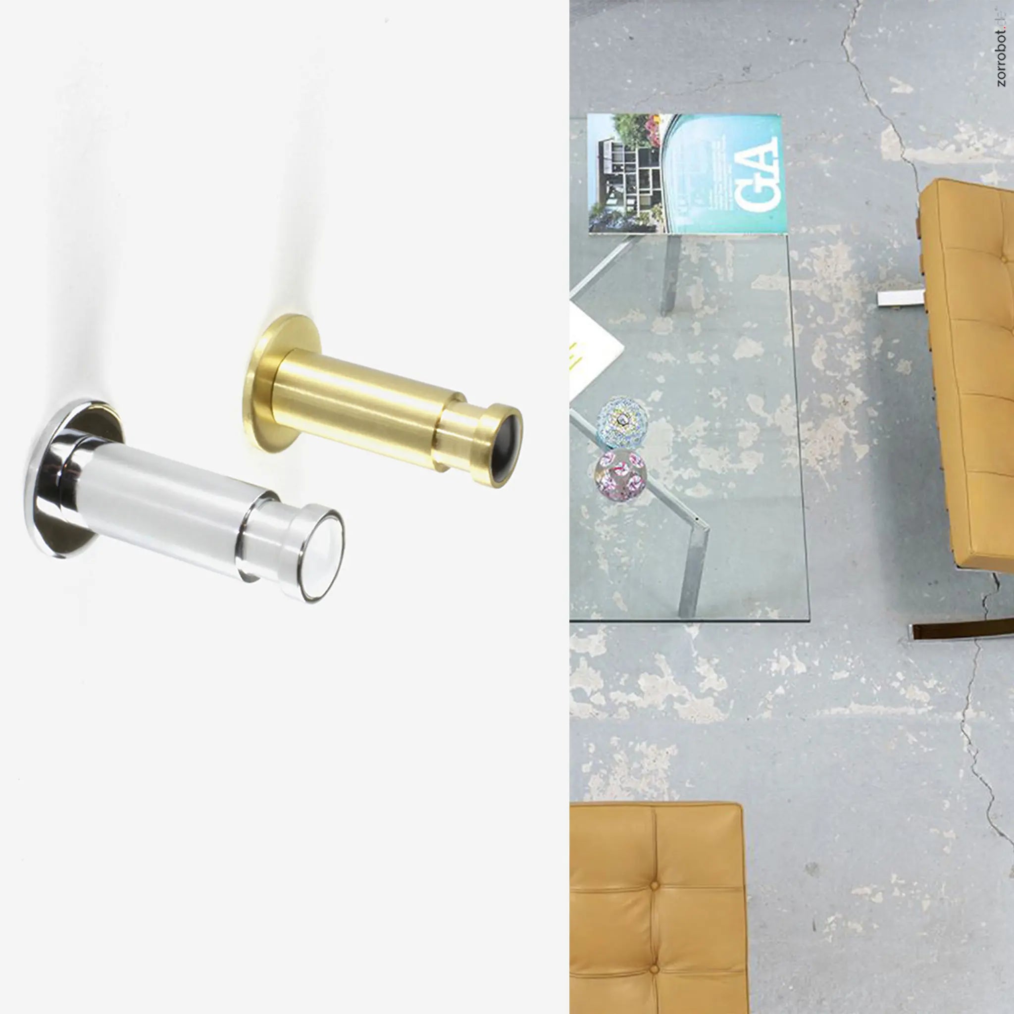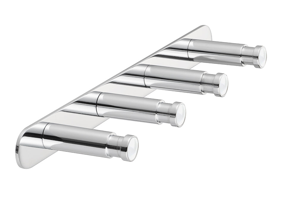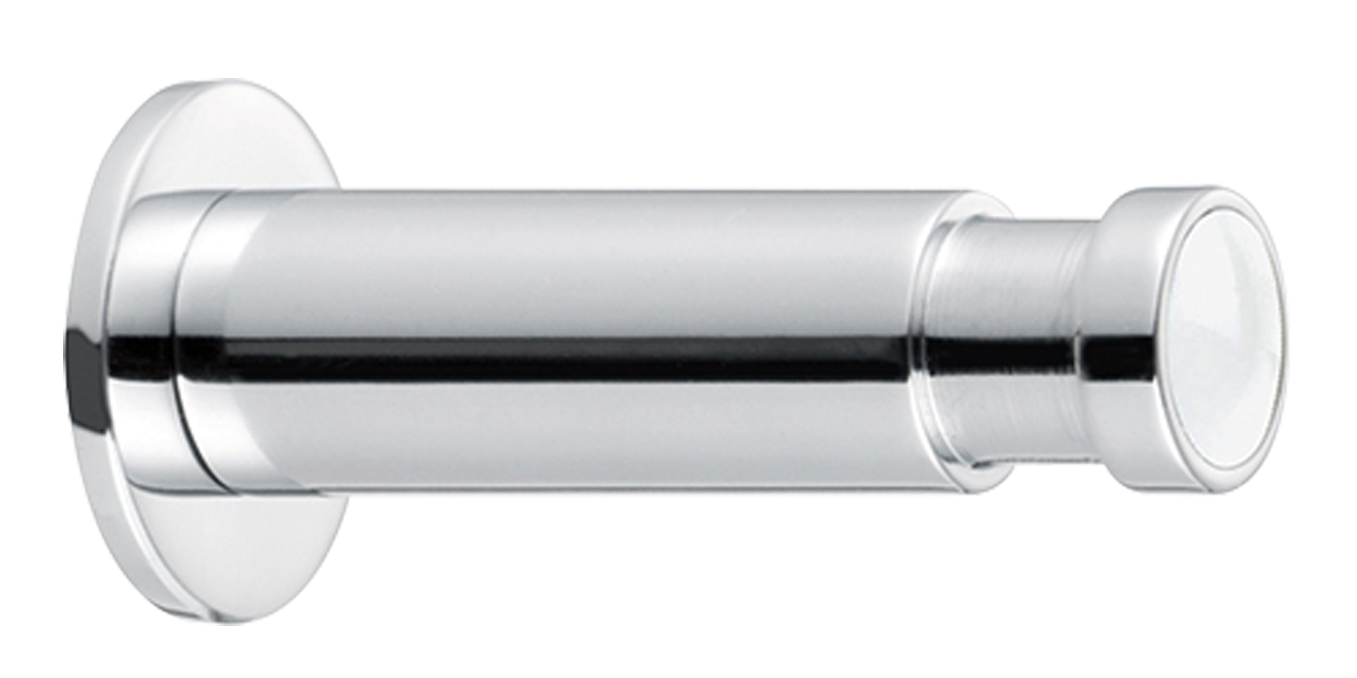 Die Idee, Schmuck-Ronden (Aufsätze) von Ringen und Broschen auf einen Stabhaken zu setzen, stammt vom Osnabrücker Schmuckdesigner faible for lable. Massiv gedrehter Messing-Kleiderhaken glänzend verchromt oder matt mit einem kleinen Magnet zum Halten der Schmuckronden und einer Stockschraube M 6 x 60 mm.
